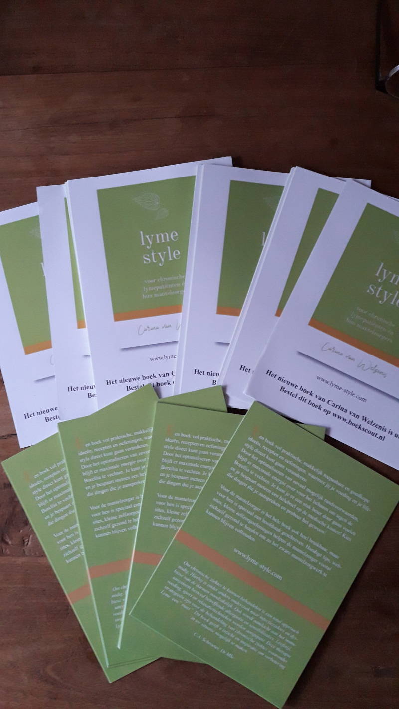 Ik heb de flyers van mijn boek lyme style, voor chronische lymepatiënten en hun mantelzorgers, binnen. Ik zou het fijn vinden om je een pakketje op te sturen. Ben je (huis-)arts, neuroloog, fysio, tuinman, werk je bij natuur monumenten of de ANWB winkel, ben je mantelzorger? Het maakt niet uit. Als jij denkt dat je wel een setje kunt gebruiken laat het me dan even weten.