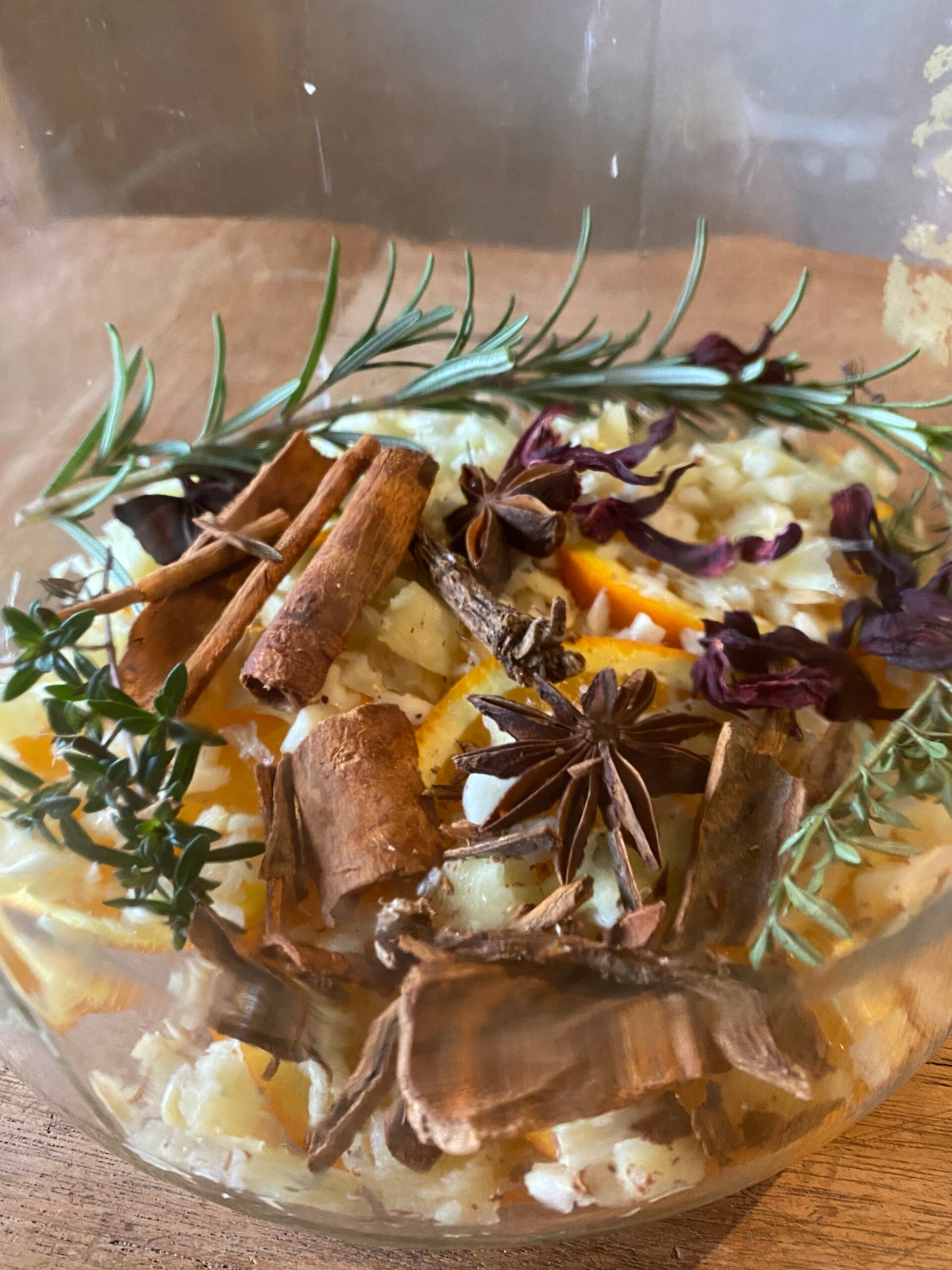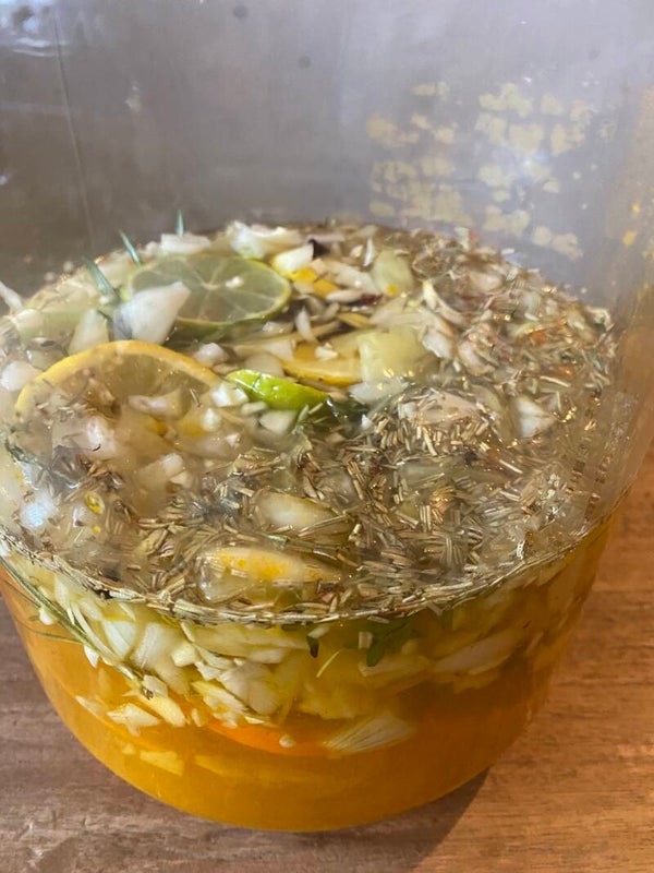 ingredienten: ui, knoflook, gember, curcuma, chilipeper, citroen, sinaasappel, rozemarijn, tijm, steranijs, peper, kaneel, hybiscus, paardenbloemwortel en appelazijn.