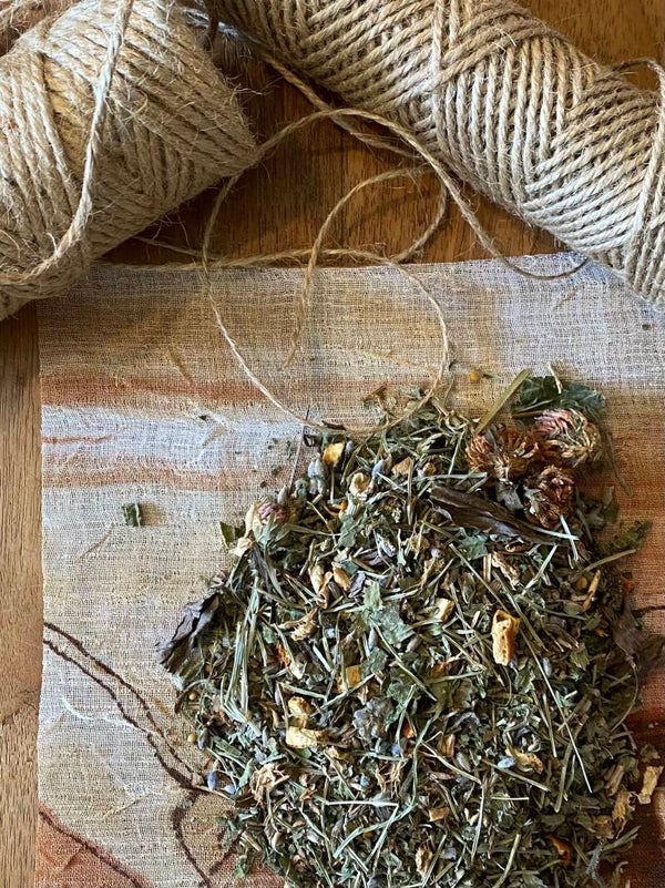 De ingredienten zijn: brandnetel, lavendel, sinaasappel, citroenmelisse, smalle weegbree, rode klaver, fenegriek, mosterdzaad, heermoes en gember.