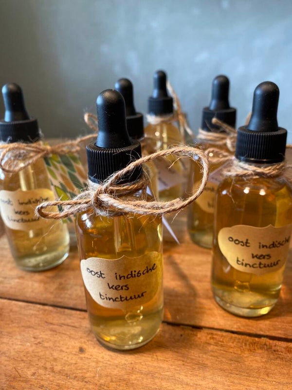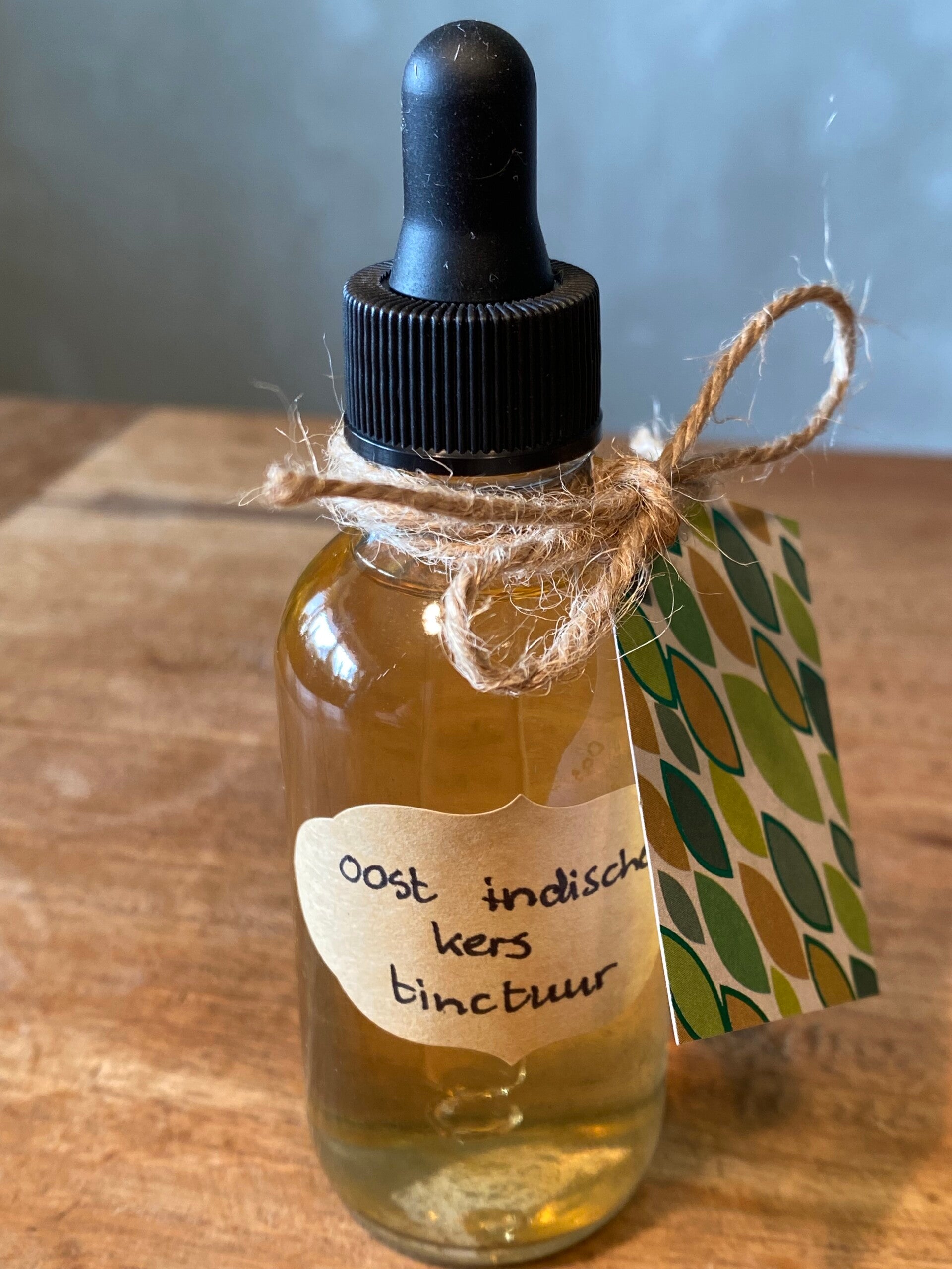 50 ml o.i. kers tinctuur van alcohol (37%) en 100% o.i. kers bloem, blad en steel. D0,5