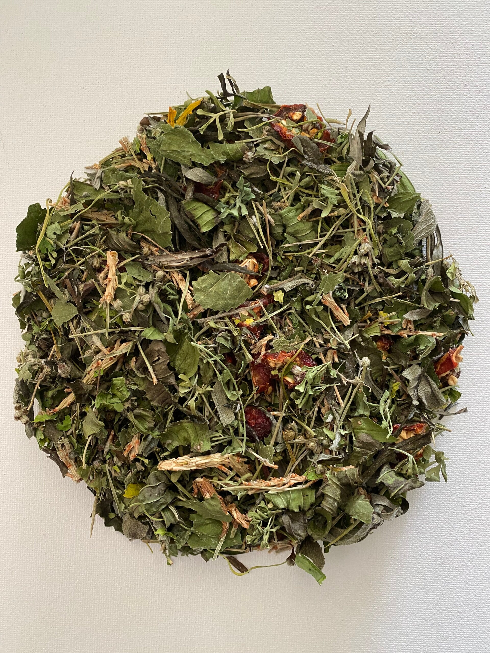 ingrediënten: wijnruit, rozenbottel, braam, dennennaald, salie, tijm, bijvoet, smalle weegbree en oost indischee kers